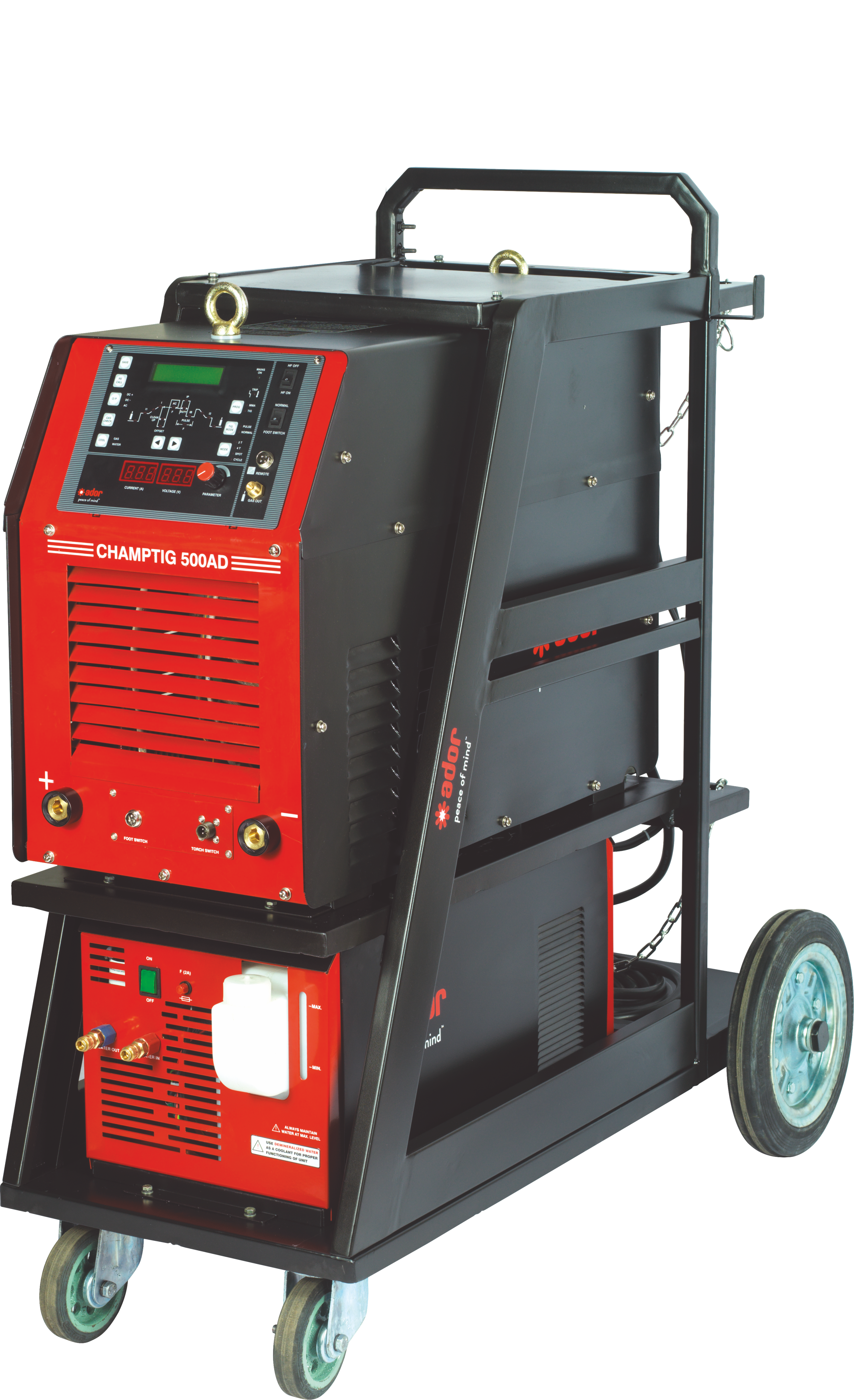 - 300 AD can be offered with suitable capacity gas cooled TIG torch or with water cooling unit, trolley and water cooled TIG torch. 500 AD is offered with water cooling unit, trolley and heavy-duty water cooled TIG torch.